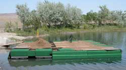 The significant ramp angle change near the water illuminated the impressive strength of the steel frame. When the front edge went down into the water, the frame lifted the back edge of the island. The welder was given a nod of approval. That is when we realized that we could have just pushed the whole thing in with the front end loader right from the get-go, and not wasted all that money on the second layer of plywood and dowels.