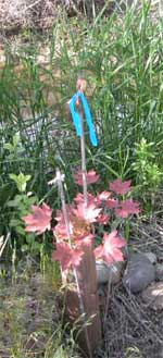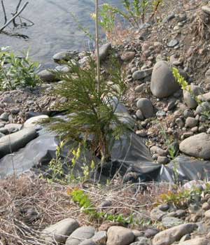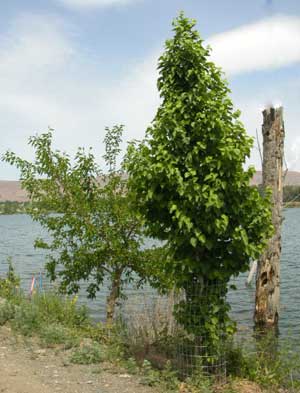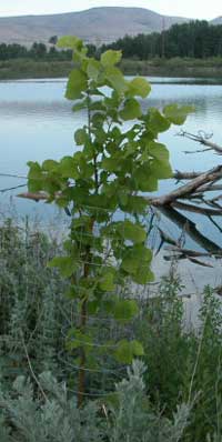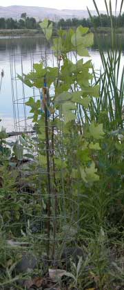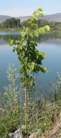 The beaver, roving the area from their home in the Swan Pond, and arriving from the adjacent Yakima River, ply their wood cutting trade in the dark of night. They are not content with the plentiful willows. The beaver take down every broadleaf tree that is not protected with fencing, including thorny young locust. The planted seedling trees are protected with plastic planting tubes while the seedlings are still very small, then wire fencing the moment before they get big enough to be put on the beaver menu. Beaver usually cut the better trees before they get large, so many neglected gravel pit ponds in beaver areas are left with a perpetually brushy shoreline, less than visually pleasing. Old gravel pit pond shores are also usually trampled by people, precluding wildlife habitat. Protecting the trees from beaver costs much more in time and money than planting trees.