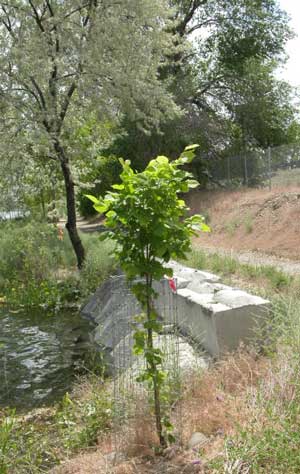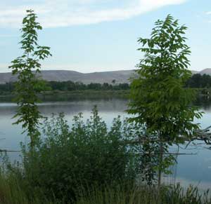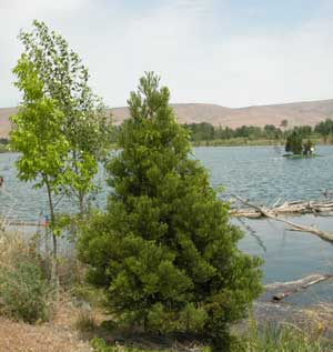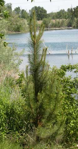 When the water filled the gravel pit in 1997, it created a new shoreline vegetative zone. In addition to the native Cottonwood, Black Locust, Russian Olive, Slippery Elm and Willow, which began growing at the new water line, a diverse variety of seedlings are being planted each year. Certain tree and shrub species are being planted to provide seed food sources for wildlife. The shore is protected from people-use, to benefit the wildlife and vegetation. It will become an arboretum.